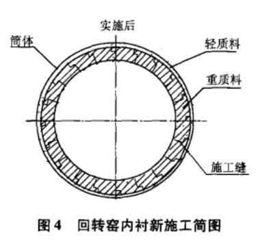 經(jīng)過與原料廠家、大修部門對該問題的共同探討,較確定將原有兩條澆注料之間的直縫施工修改為有錯臺的施工縫,阻擋在高溫條件下高溫炭粉由施工縫進入輕質(zhì)料層。回轉窯內(nèi)襯新施工簡圖見圖4。此項措施較明顯地改善了內(nèi)襯的使用狀況,次采用就使回轉窯內(nèi)襯的使用壽命提高到了440天以上。