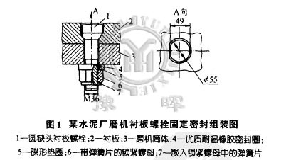 所以水泥廠從國外引進生料磨、水泥球磨機等多種設備投入運轉(zhuǎn)。其襯板固定螺栓采用了帶彈簧片的鎖緊螺母和碟形墊圈加優(yōu)質(zhì)耐溫像膠密封圈進行緊固和密密封等新型結構,使用多年來一直很理想,如圖1所示。